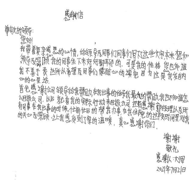 经过半个月治疗休养,刘军手部已无大碍。出院后的他写了一封感谢信并为公司送了一面锦旗,他说道,是金年会-金年会(中国)一站式体育服务平台这个大家庭让他感受到了关怀和温暖,他表示要把这种关怀变成工作上的动力,争取早日返回工作岗位,努力工作,回报大家的关心和关爱。